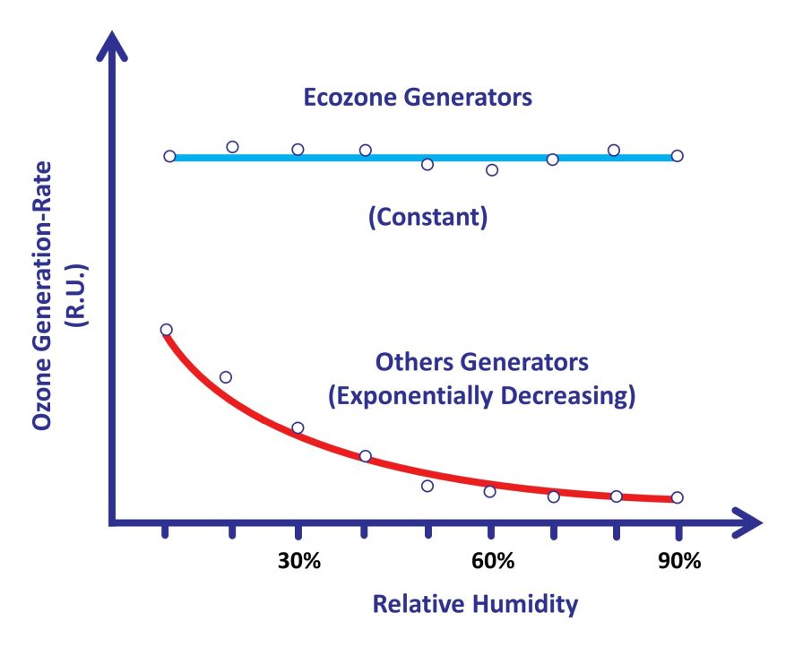 These graphs shows the ozone generation-rate [in relative units (R.U.)] as a function of the relative humidity level (R.H, in %) in the air. The upper (blue) curve shows the ozone generation-rate of Ecozone unique ozone generators which is constant, independent on the humidity level.